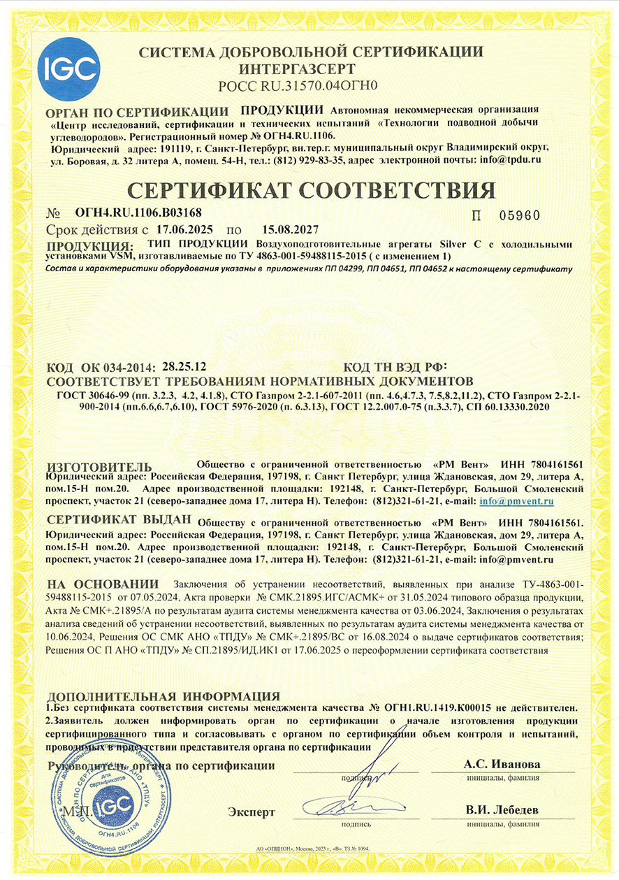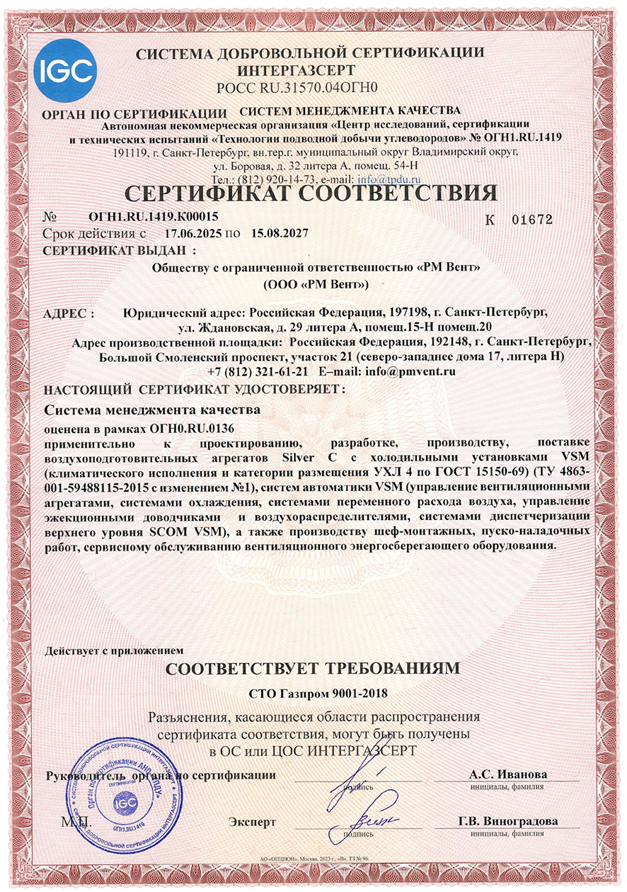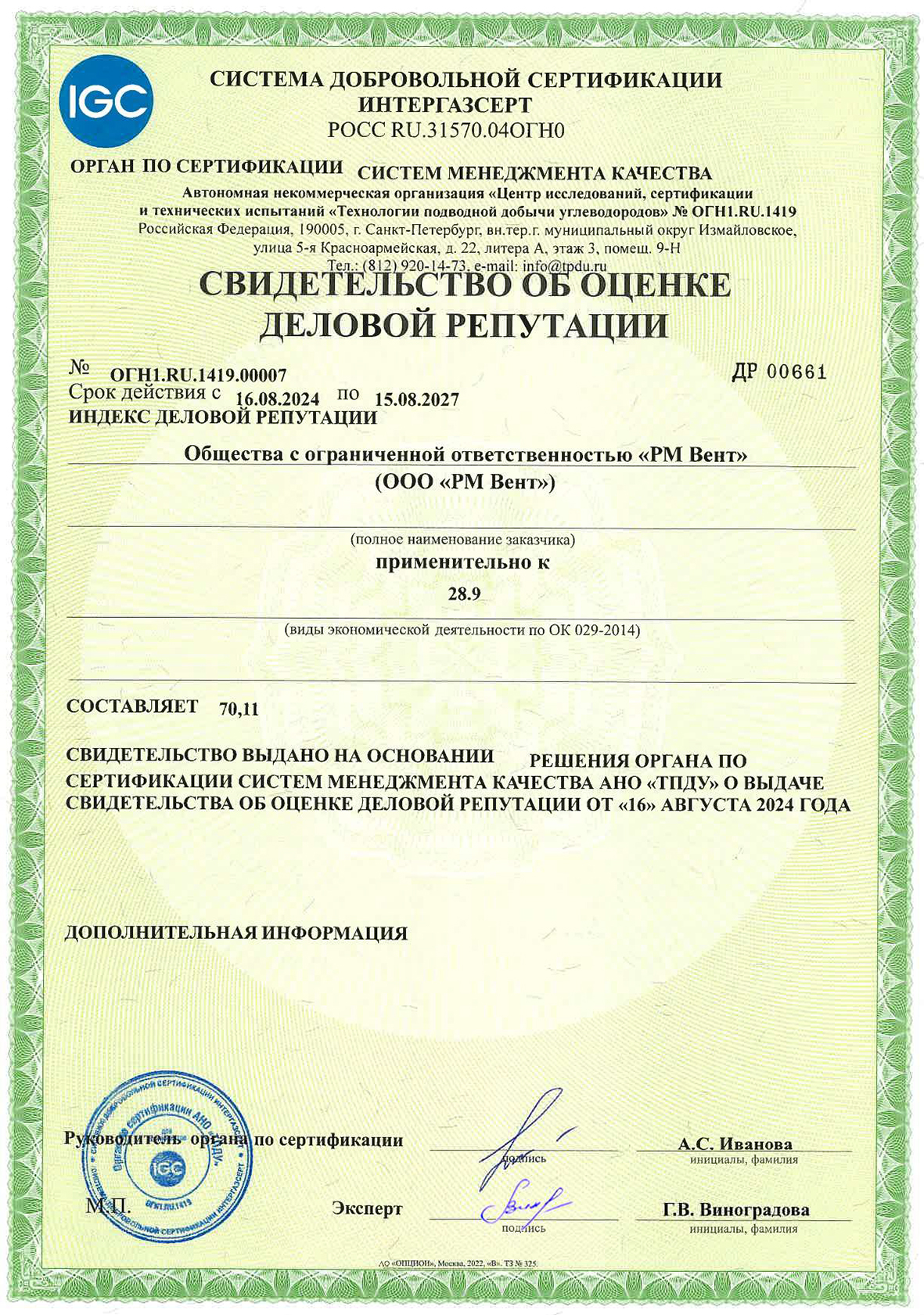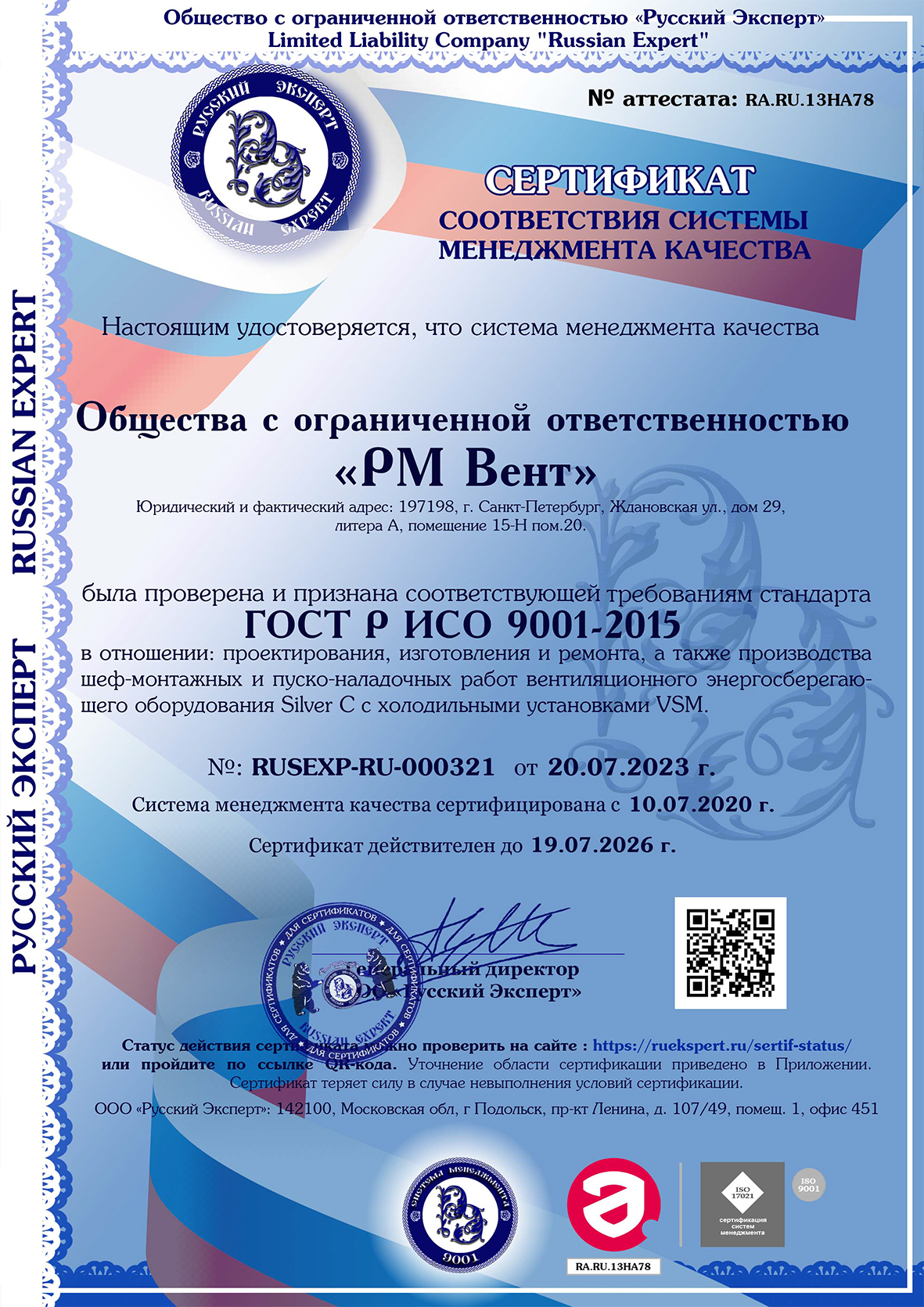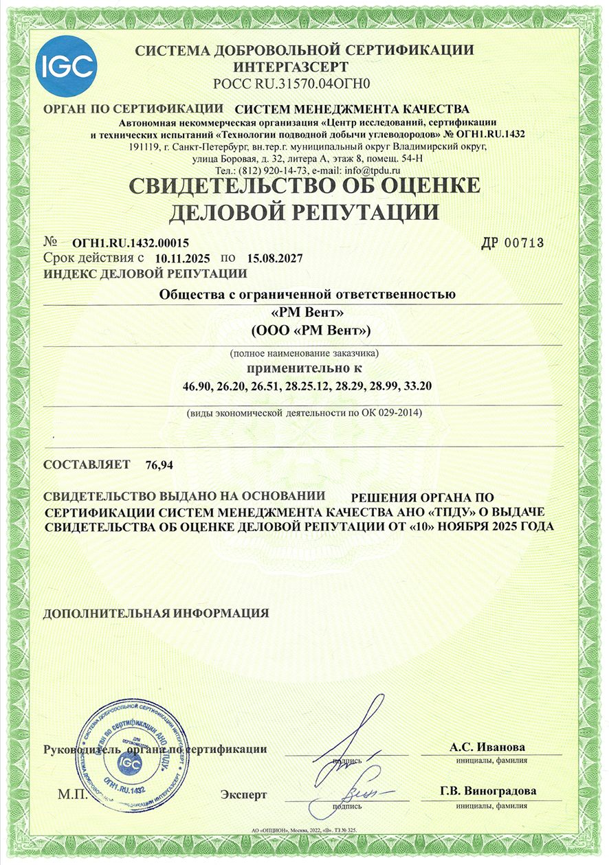 Оборудование, предлагаемое компанией РМ Вент, имеет все необходимые российские и международные сертификаты, подтверждающие соответствие применяемых технологий заявленным параметрам, а также регулярно проходит добровольную сертификацию для подтверждения качества и возможности применения в разных типах зданий.